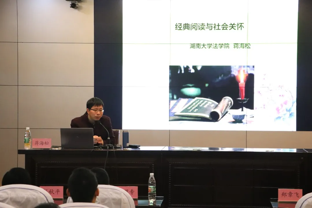 副院长、“全国七五普法先进个人”获得者蒋海松老师作题为“经典阅读与社会关怀”的讲座,湖南大学师生100余人参与了聆听。