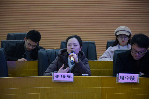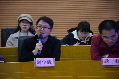紧接着,宋大琦、黄守愚、彭中礼以及我院李婧嵘、周宇骏、欧扬等老师一一对杜教授的演讲进行点评。诸位评论人肯定了主讲报告史料价值大、论证严谨、推理有力、语言通俗易懂等方面优点,也从不同的角度提出了自己的商榷意见。如宋大琦副教授从“老子之道”、“庄子之道”、“儒家之道”等方面重新梳理了“道”的概念;黄守愚高度赞同中国古代法律之祖不是蚩尤而是伏羲,但道如何转换为法需要探讨;彭中礼教授提出,中国与西方的法律建构基础有很大的差别,中国究竟如何重建自己的“道”,推翻法理学提倡道法学需要更充分的证据表示疑问。李婧嵘老师探讨了我国立法、司法应如何重建道统以及传统儒家文学能否适应现代生活等问题。周宇俊老师认为,关于道与法的关系问题,“道”强调认知上的合规律性,而法律更强调基于认知和实践基础上的合规律性。欧扬老师提到,关于法律移植问题,我们既不能全盘西化,也不能主张全盘复古,如何把儒家法律文化与现代生活结合起来仍值得进一步探究。蒋海松老师提出道是中国古代思想最高的核心概念,很难通过一场讲座说清,“道”作为一种价值文化值得肯定,但在今天已经很难成为有效的制度建构资源,而且在古代其意义也不能拔高。杜教授随后就以上问题给予回应。