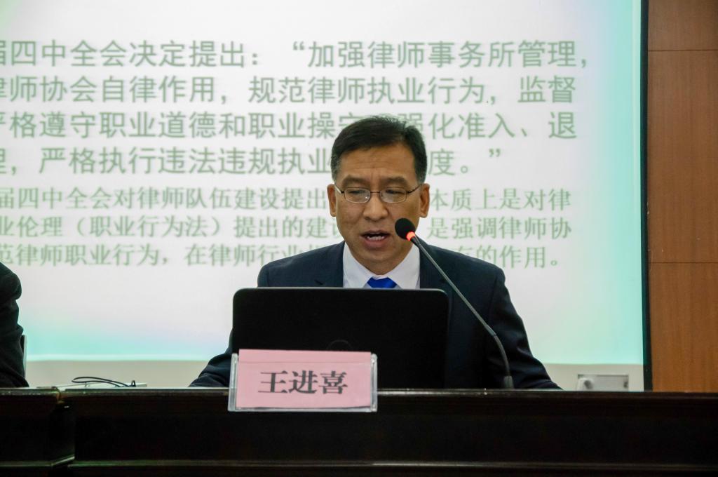 王进喜教授首先从十八届四中全会决定对律师队伍建设的要求出发,阐明法律职业伦理的概念、对象、责任等,对律师职业伦理的重要性和基础性进行论证;其次,王教授从律师职业行为规则制定的二元化和律师惩戒的二元化等方面提出我国律师职业伦理建设与执行的二元化;随后,王教授基于律师执业实践,提出目前律师职业伦理建设主要存在以下困境:一是律师协会对律师执业行为规则作为规制手段的重视程度不够;二是律师协会规范的立改废处于无序阶段;三是律师协会现有规范的科学性、有效性有待加强;四是律师协会规则的非必要多元化,如上海市律师协会与广州市律师协会对律师执业冲突的认定和处理规则不一致,既有悖于行为尺度的统一性,同时又浪费了立法资源;最后,针对上述问题,王教授提出了以下解决措施:一是正确认识律协的性质,律师协会与一般的社会团体法人不同,我国律师协会具有公法人的性质,属于自治行政;二是进一步加强律协建设,提高律师协会的自律管理能力;三是对律师协会进行结构性改革,深化律师协会的改革和治理手段的改革。