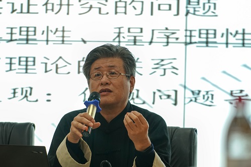 白建军教授以《有什么方法,就有什么视界——以商业银行刑事风险研究为例》为题向与会成员作主旨报告。首先,白教授旗帜鲜明地指出实证研究与规范研究二者之间的关系,即实证研究离不开规范研究,但是规范研究可以没有实证研究。实证研究是建立在规范研究基础之上的经验研究,是法学研究方法中不可替代的一种存在方式。纯粹的规范研究和思辨结论往往只能回答应然层面的问题,而实然层面的问题则需要实证研究来解决。其次,白教授认为做实证研究的学者应当有一种使命感,一要发现法学知识之间的相互印证,二要做一些“留得住”的成果作为我们这个时代的法律的客观记录。三要发现“黑天鹅”,几乎所有的理论,都是尚未被证否的假设,那些人们以为是正确的理论,往往不是人们所预想的那样。四要发现理论的边界和局限。五要发现适合实证研究的问题。六要发现实证研究的工具理性和程序理性。七要发现事实和理论之间的联系,这也是法学实证研究最难的部分。最后,白教授指出目前做实证研究的学者主要依托于裁判文书网,并以法院的案由作为建立样本库的基本根据,这种方法确实简单且能够反映现实法律世界中的一些现象,但应当认识到,案由体系实际上是已经根据现有制度、主观判断等因素加工过之后筛选出来的一个分类体系,而事实原本的状态也许不是这样的,白教授向与会成员分享了自己突破案由体系建立样本库的具体尝试。