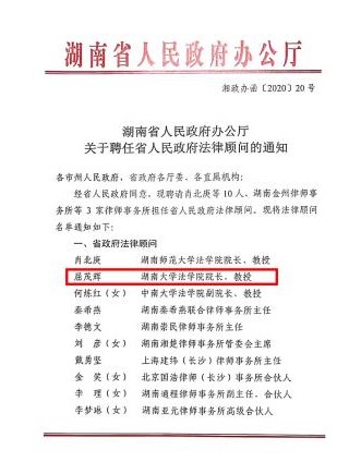 近日,湖南省人民政府办公厅发布了《湖南省人民政府办公厅关于聘任省人民政府法律顾问的通知》(湘政办函〔2020〕20号),棋牌游戏官网