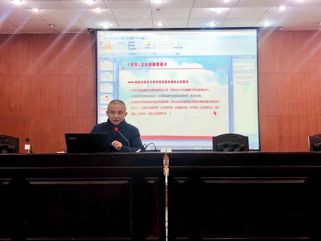 组织研究生导师学习《研究生导师指导行为准则》、《关于全面落实研究生导师立德树人职责的意见》等文件,学习贯彻落实全国教育大会、全国研究生教育会议及棋牌游戏官网