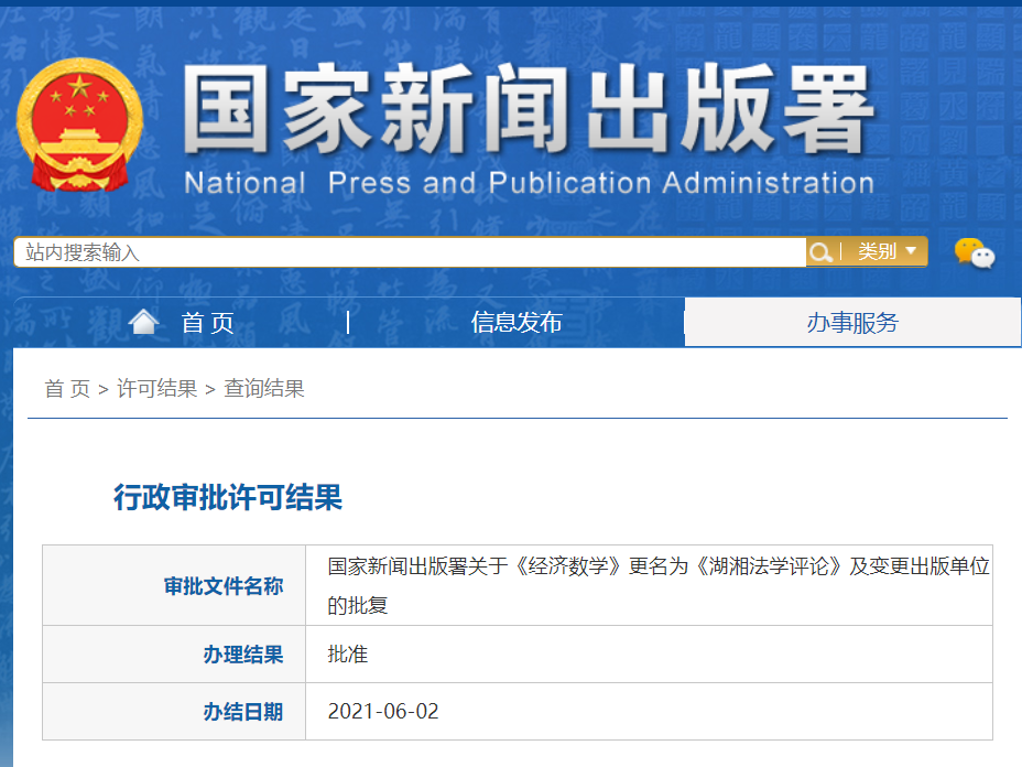 (国家新闻出版署就《湖湘法学评论》变更事宜的批复 ,截图来自新闻出版署官网)