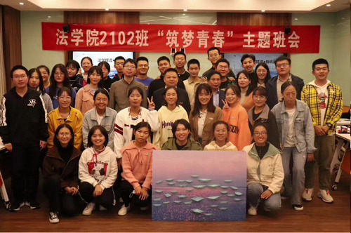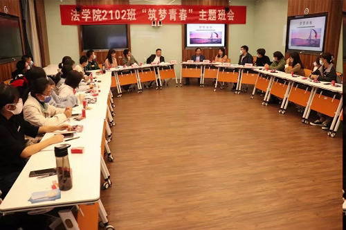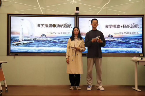 2021级本科生辅导员张丹、2021级迎新团队成员金博涵及法学2102班全体同学参会。本次班会由法棋牌游戏官网