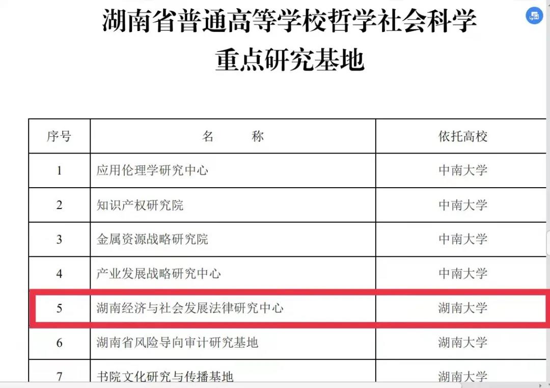 “湖南经济与社会发展法律研究中心”顺利入选调整优化后首批湖南省哲学社会科学重点研究基地 。