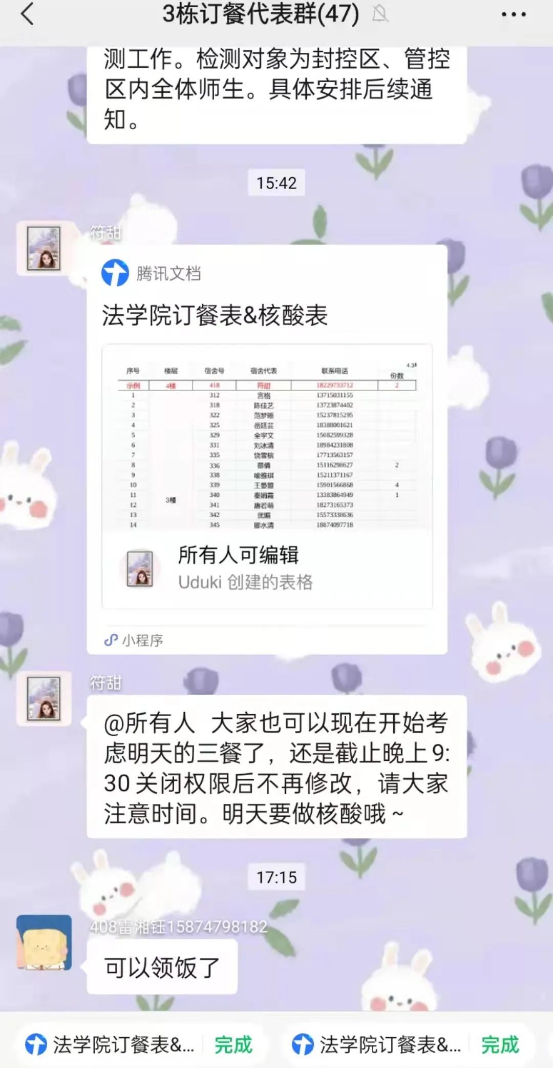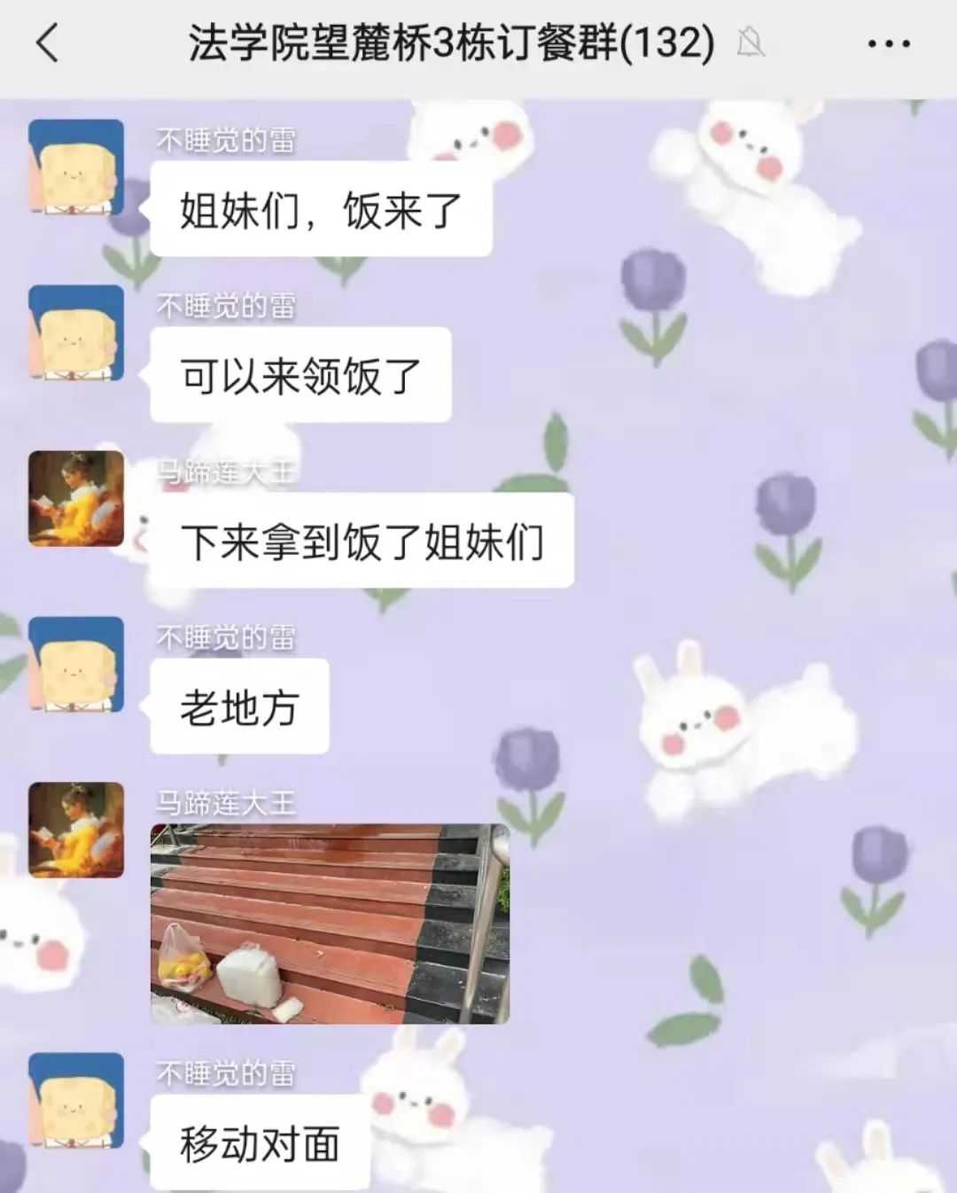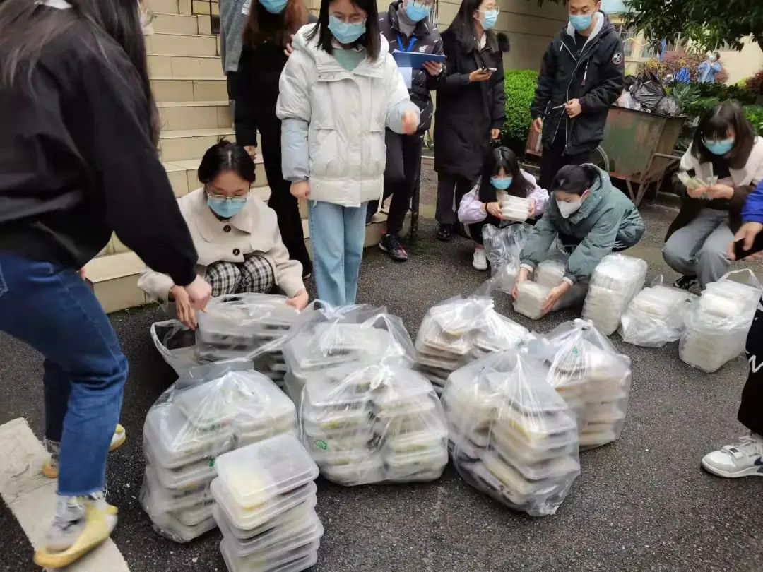 封校后的宿舍园区,同学们的饮食成了亟待解决的问题。志愿者每天不厌其烦、任劳任怨地统计同学们一日三餐的订餐数量,与送餐的食堂人员核对信息,按时下楼接收物资,并及时告知同学们自提领取。3栋志愿者们体现出巾帼不让须眉的架势,将几百份饭菜运往派餐的指定地点。志愿者们将简单的事情重复做,重复的事情用心做,送去的是同学们的生活物资,传递的确实对同学们的关心与关爱。