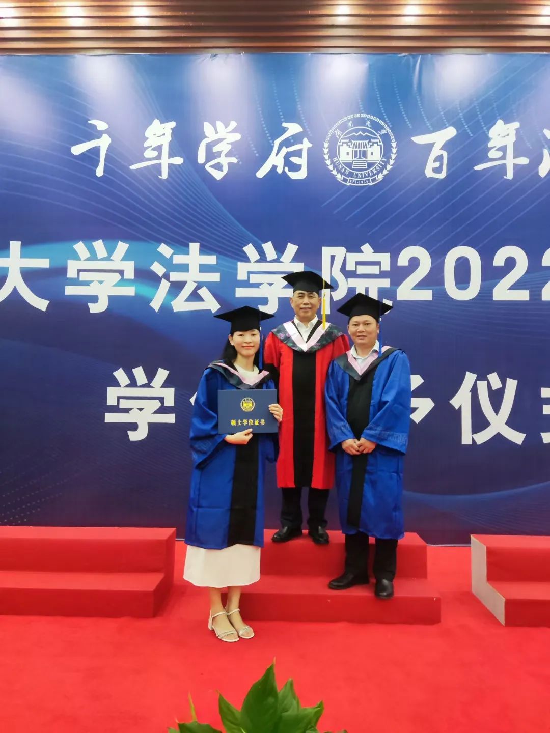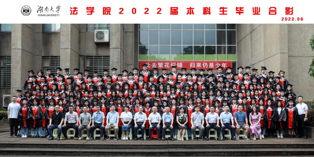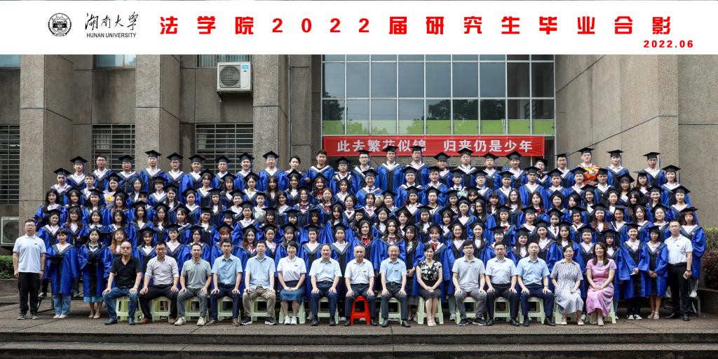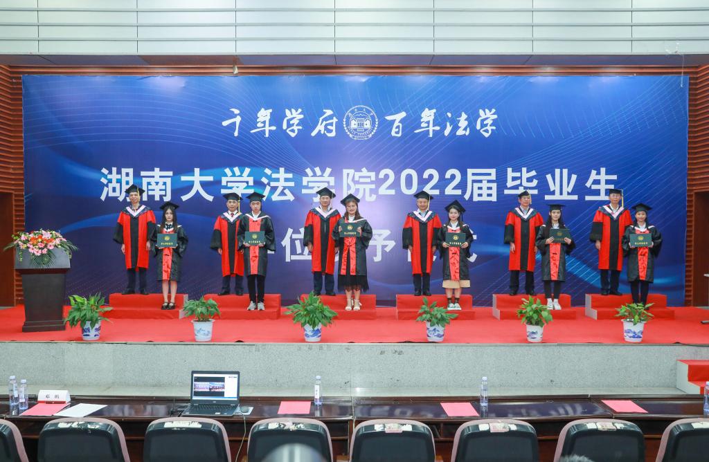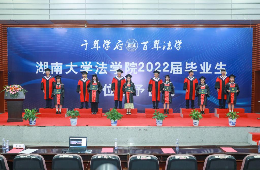 2022年学位授予决定》,对9位法学博士、195位硕士研究生及160位本科生作出授予学位的决定。宣读完毕,每一位毕业生身着学位服,整齐有序上台,张智辉、谢佑平、黎四奇、屈茂辉、郑鹏程、肖海军、李小明、高中等学术委员会成员为毕业生颁发证书、拨穗授位并合影留念.