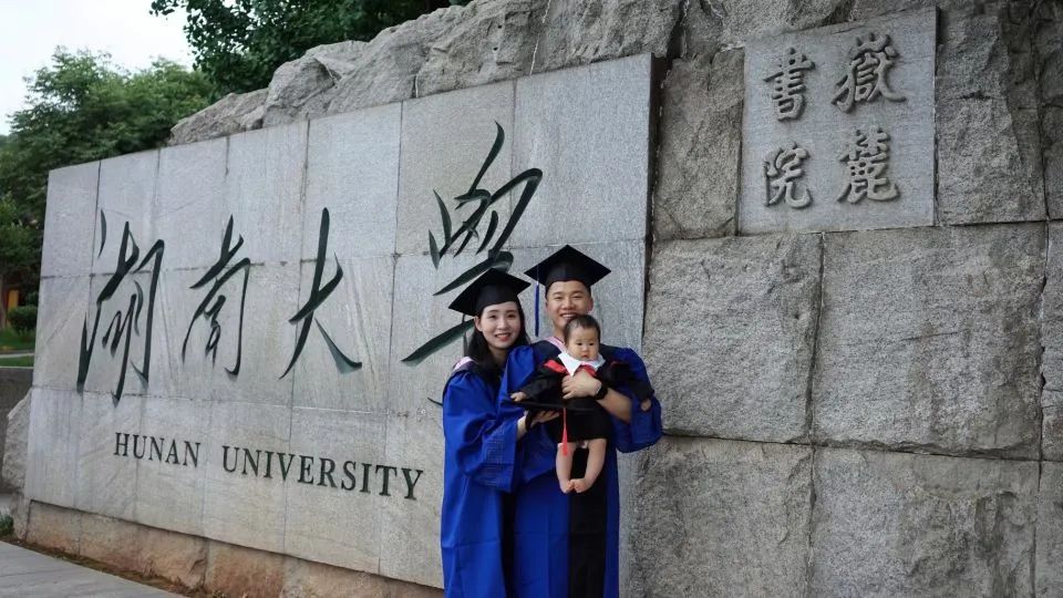 (一位硕士毕业同学带着自己刚出生不久的孩子参加典礼,小宝贝看着爸爸毕业啦)