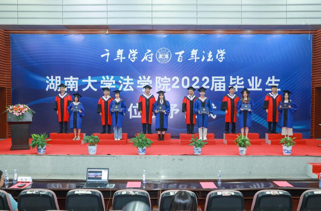 院长黎四奇,院党委书记易骆之,院学术委员会成员张智辉、谢佑平、屈茂辉、郑鹏程、肖海军、李小明、高中,党委副书记、纪委书记罗英,副院长喻玲、湛建云、蒋海松、王文胜,院长助理展鹏贺、毕业生导师代表汪全军、郭哲等,JM中心执行主任宋晓庆、辅导员、行政教辅老师、2022届本、硕、博毕业生 。北京市康达(长沙)律师事务所邓鹏律师、湖南湘达律师事务所张跃胜律师 、湖南真诚律师事务所周金艳律师作为院友代表受邀参加典礼。仪式由棋牌游戏官网