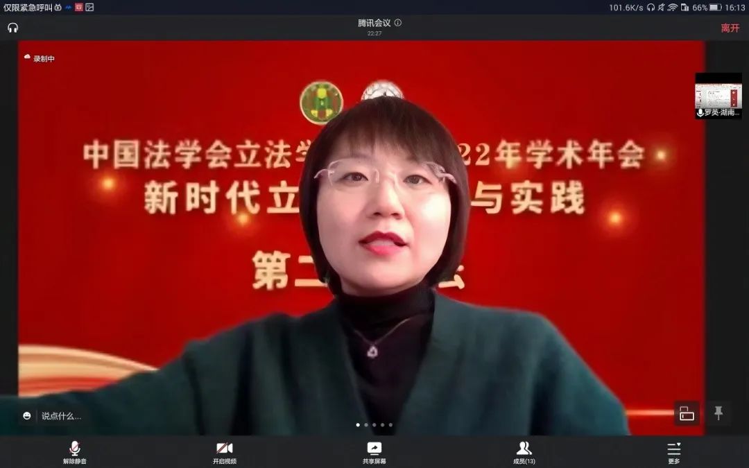 罗英副教授、周宇骏助理教授受邀于第二分论坛“立法体制机制技术”第二单元发言。罗英副教授发言主题为“《立法法》中监察立法权条款之创设研究”。她首先介绍研究背景,指出该文是在公法蓬勃化研究趋势下所产出的成果,同时也将本次《立法法》修改作为契机推进研究。其次,她从形式法治和实质法治两方面,对修改立法法是实现监察立法权规范化的最优解做了阐释。最后,她对于《立法法》修改中具体条款的拟定做了报告。