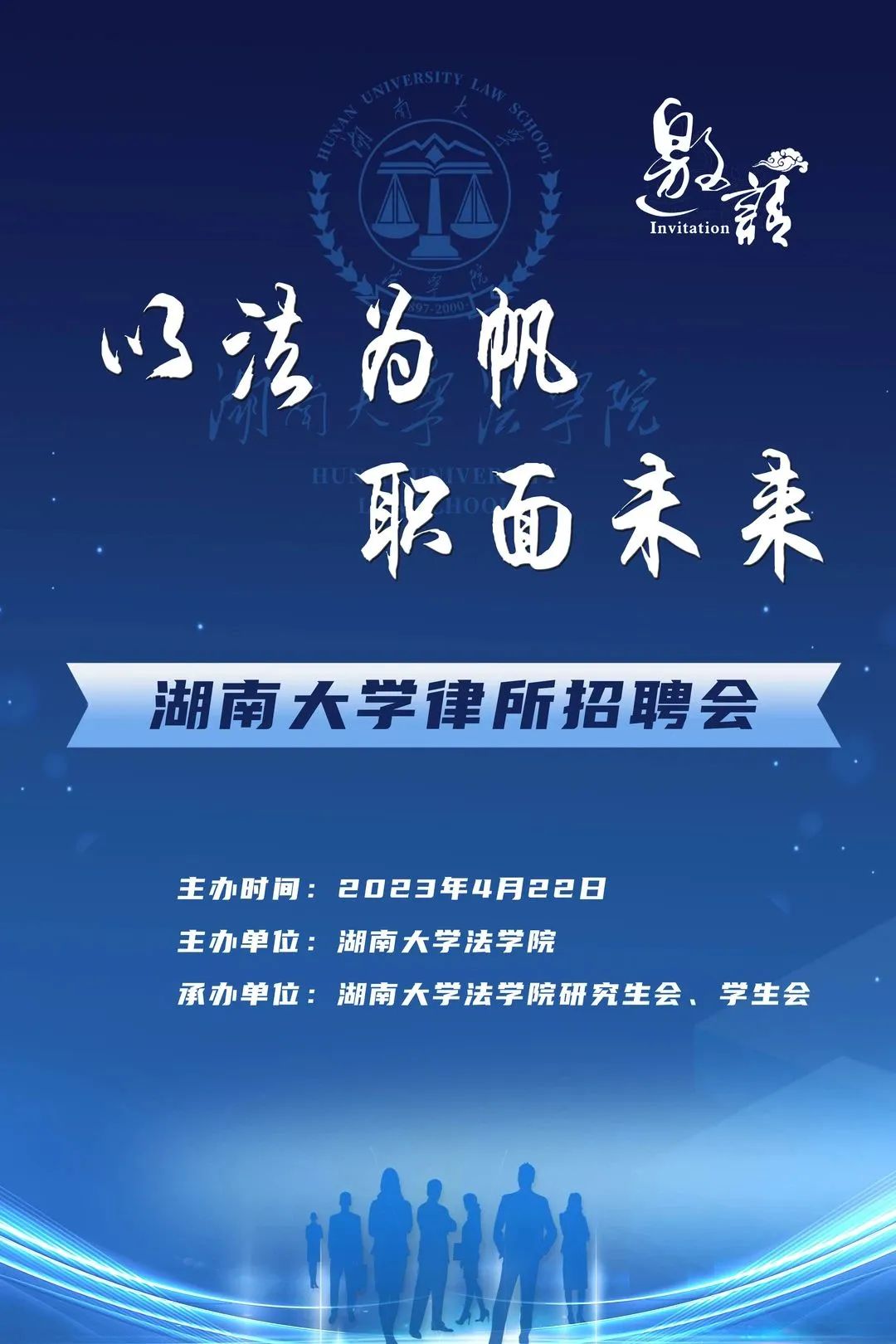 定于2023年4月22日举办“湖南大学律所招聘会”,诚邀贵单位莅临本次会议,现就有关事项函告如下: