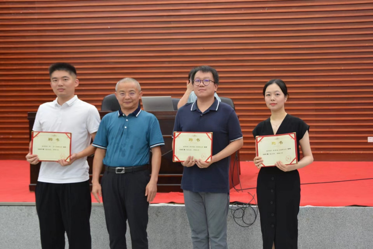 罗英副书记向新生及家长介绍2023级本科辅导员龙芷蔚老师及各班新生班主任,随后由黎四奇院长为2023级新生班主任周宇骏、何宁、李婧嵘老师颁发聘书。
