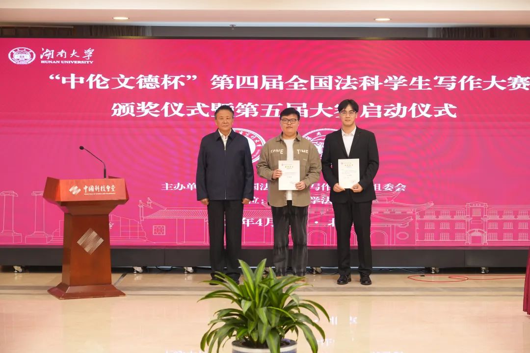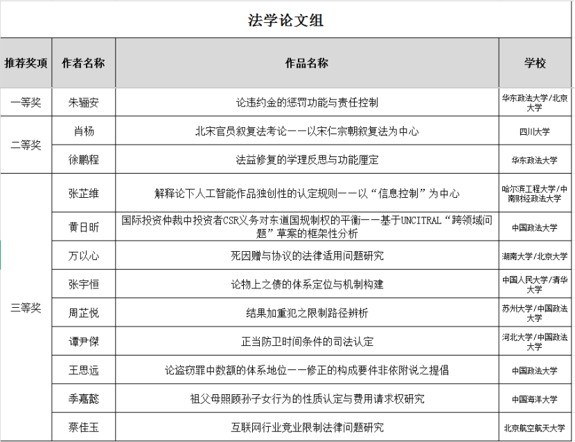 哈尔滨工程大学/中南财经政法大学张芷维、中国政法大学黄日昕、湖南大学/北京大学万以心、中国人民大学/清华大学张宇恒、苏州大学/中国政法大学周芷悦、河北大学/中国政法大学谭尹傑、中国政法大学王思远、中国海洋大学季嘉懿、北京航空航天大学蔡佳玉获得法学论文组三等奖,大赛组委会成员单位代表、《中国法学》总编辑、中国人民大学法棋牌游戏官网