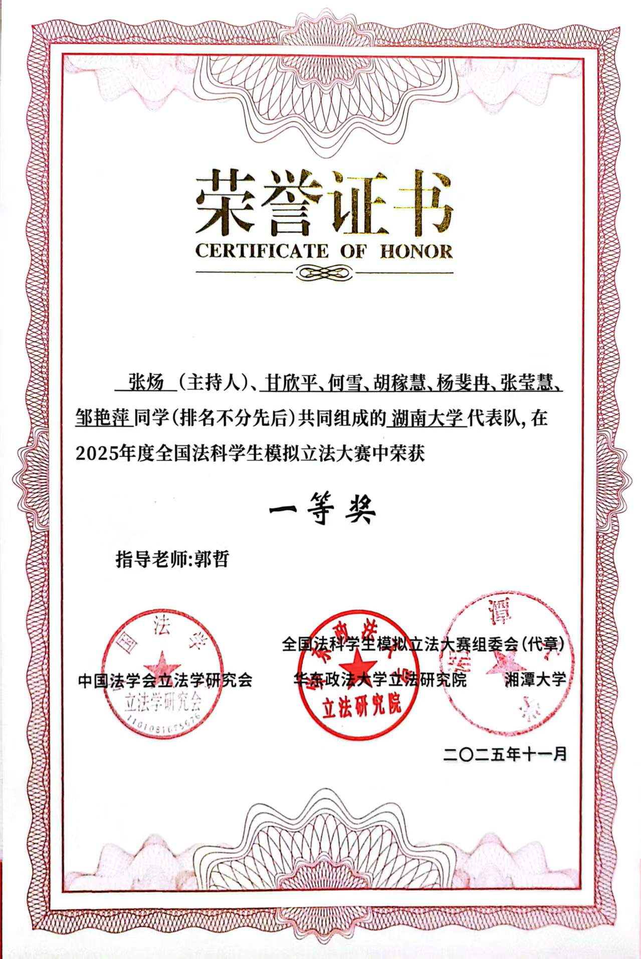 参赛队伍由郭哲教授担任指导老师,由2023级本科生张炀担任负责人,成员包括2023级本科生甘欣平、何雪、胡稼慧、杨斐冉、张莹慧、邹艳萍。在历时数月的备赛过程中,全体成员充分发挥主动性和创造性,高质量完成了实证研究、资料梳理与条文起草等各项工作。她们立足湖南省情,系统梳理本土诉求,以问题为导向精心起草了《湖南省实施〈中华人民共和国民营经济促进法〉规定(草案)》,构建了富有湖湘特色的地方立法方案。
