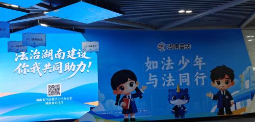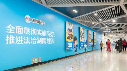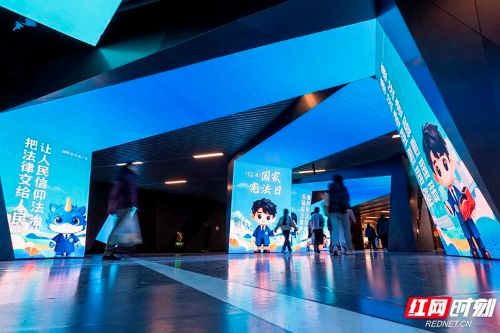长沙地铁数字艺术馆宪法主题动态光影展,以司法行政蓝为主色调,运用LED大屏和AI等前沿技术,生动展现湖南普法的“如法少年”形象,弘扬宪法精神,打造沉浸式的宪法精神宣传空间。