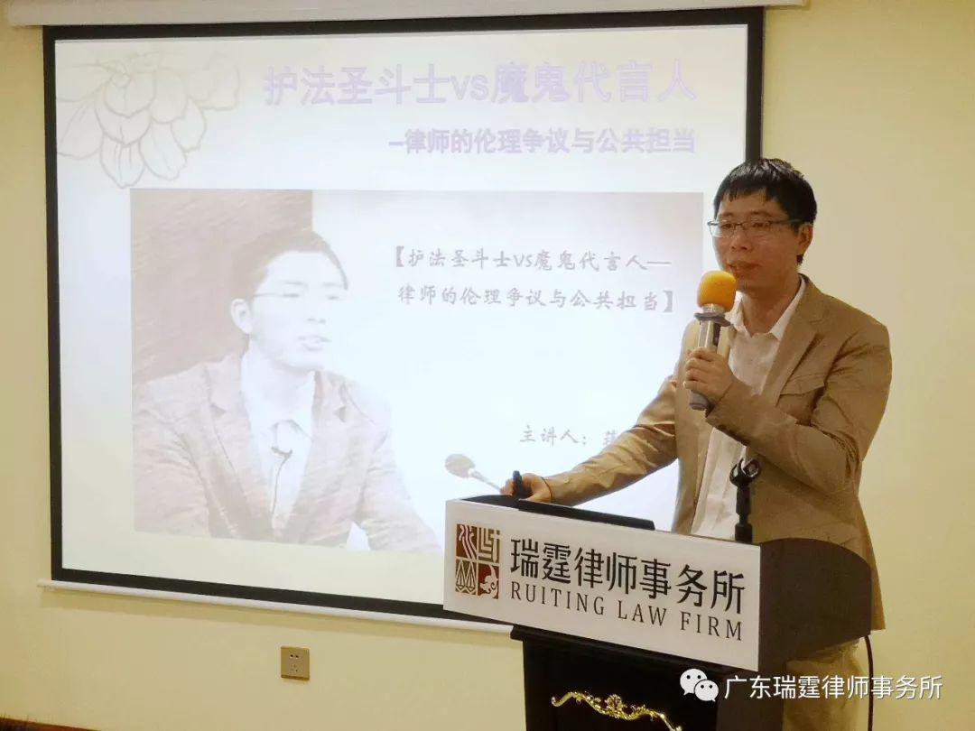 2018928日,受广东深圳瑞霆律师事务所邀请,棋牌游戏官网 副教授蒋海松老师赴深圳进行“瑞霆大讲堂”第三期学术讲座《魔鬼代言人VS护法圣斗士—律师职业伦理二重性拷问》。瑞霆律师事务所主任王丽娜、执行主任王先友及深圳市福田区诸多律师事务所主任学员等共计40余人参与讲座,本次讲座由高级合伙人林志平主持、副主任陆晖致欢迎辞。