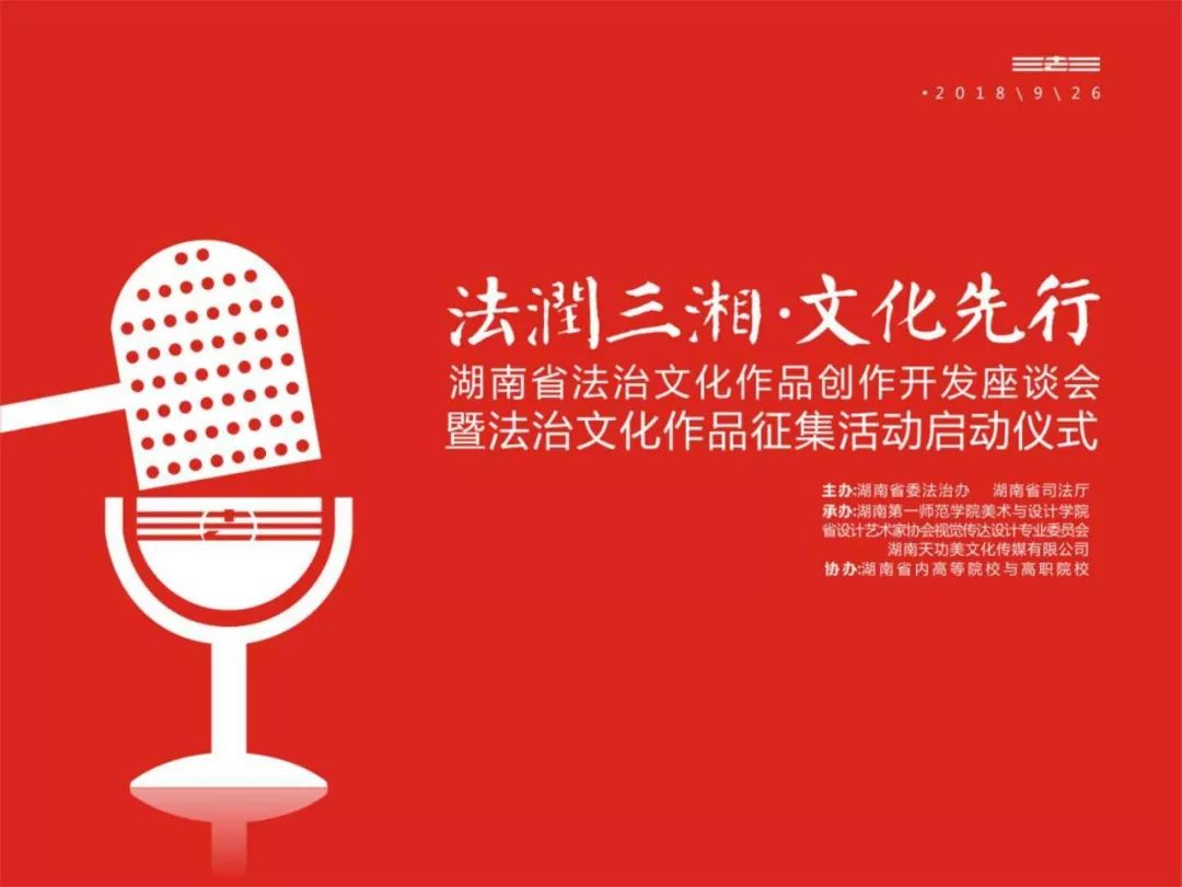 2018926日上午,由湖南省委法治办、湖南省司法厅主办,省设计艺术家协会视觉传达设计专业委员会、湖南第一师范棋牌游戏官网 和湖南天功美文化传媒共同承办的“湖南省首届法治文化作品创作开发座谈会暨法治文化作品征集活动启动仪式”在湖南第一师范棋牌游戏官网 隆重举行。