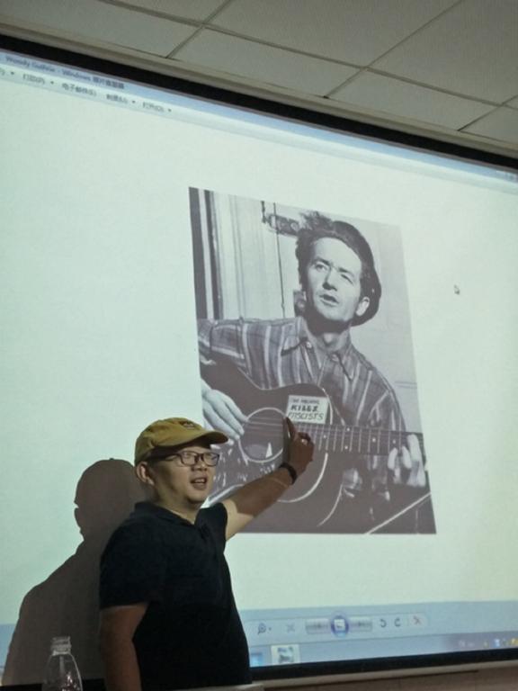 他还介绍了承接Woody精神衣钵的Bob Dylan、Joan Baez、Judy Collins、Suzanne Vega的音乐作品及其社会贡献,重点分析了获得诺贝尔文学奖的鲍伯·迪伦(Bob Dylan)音乐发展过程。