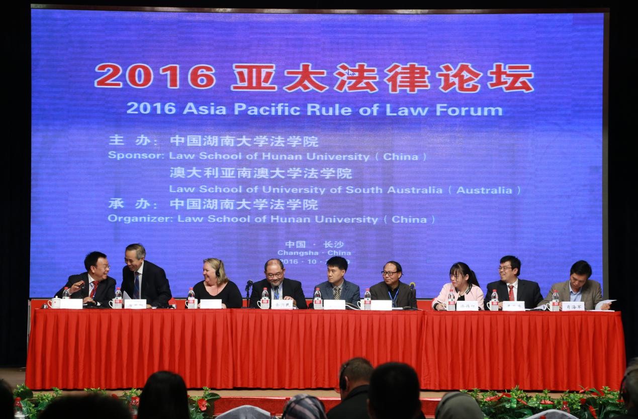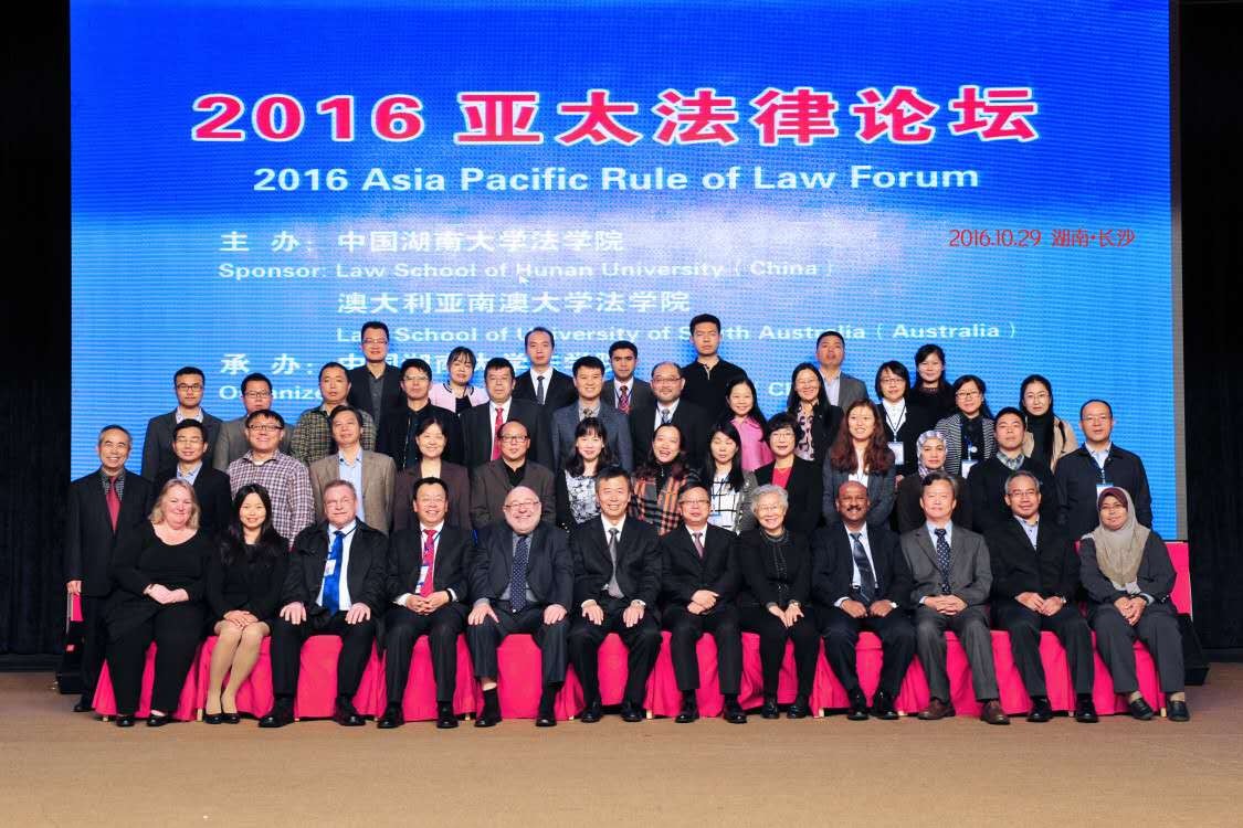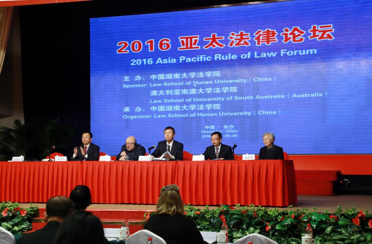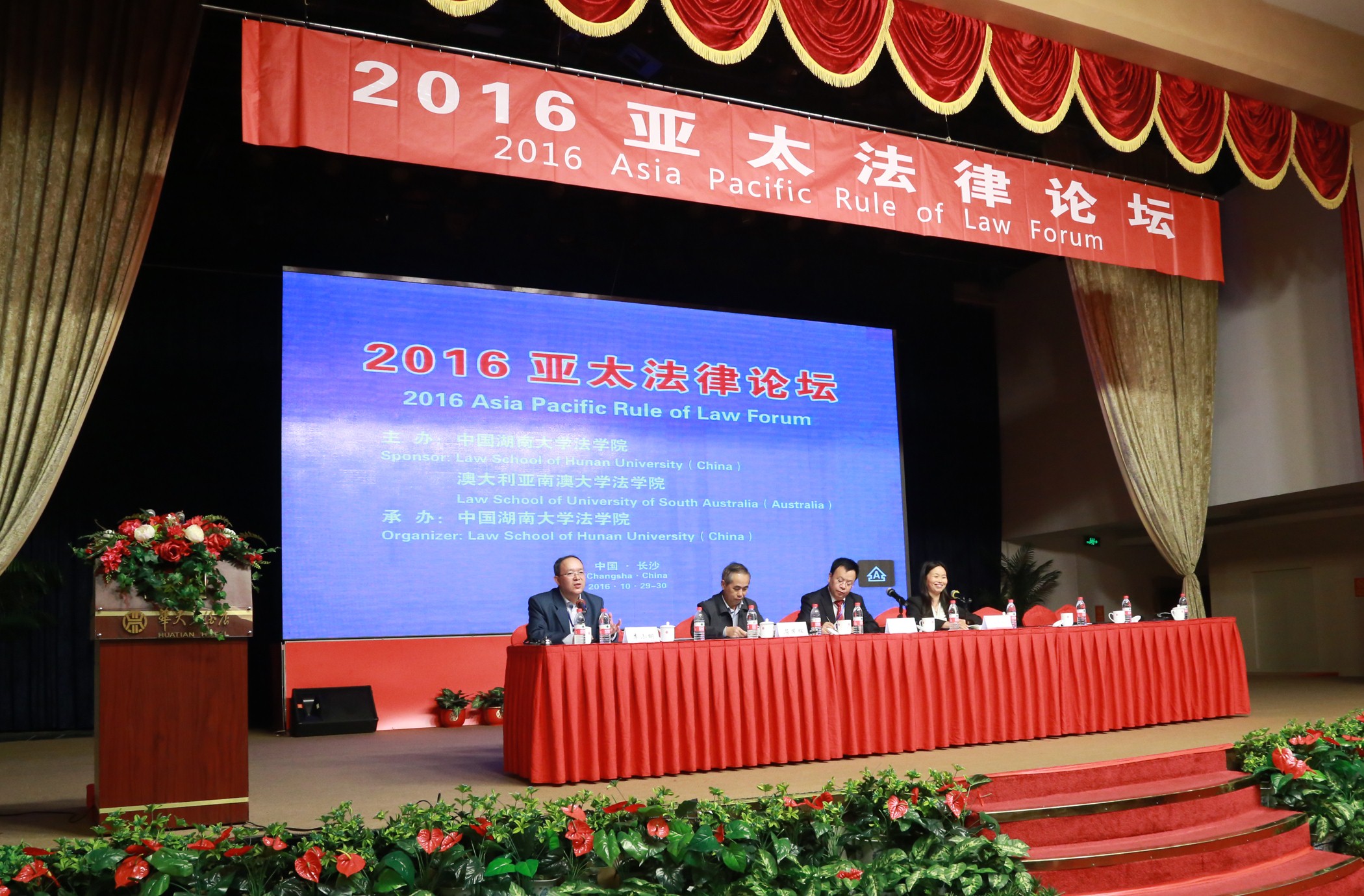 2016年10月29日至30日,由棋牌游戏官网 与澳大利亚南澳大学法棋牌游戏官网 共同主办、棋牌游戏官网 轮值承办的“2016亚太法律论坛”在长沙华天大酒店召开。来自澳大利亚南澳大学、马来西亚国立大学、美国凯特林大学、英国班戈大学、韩国忠北大学、我国台湾地区东吴大学、中南财经政法大学、湘潭大学、中南大学、湖南科技大学、湖南大学等海内外高校和司法系统逾39位专家学者与会。湖南省高级人民法院副院长、审判委员会委员、一级高级法官杨翔;中国政法大学副校长时建中教授;湖南大学党委副书记陈伟教授;当代法学名家棋牌游戏官网 王晓晔教授;棋牌游戏官网 院长屈茂辉教授等学者和专家出席了会议。