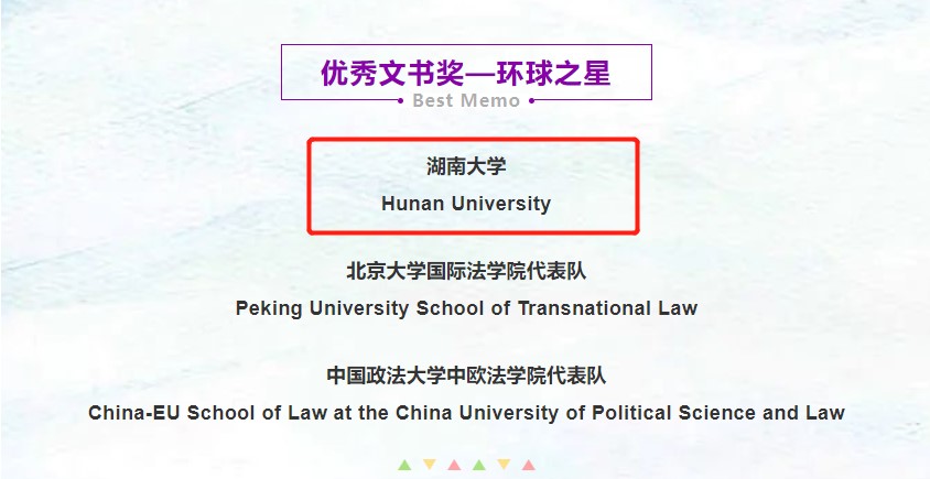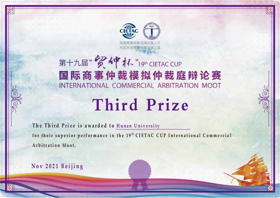 在第十九届“贸仲杯”国际商事仲裁模拟仲裁庭辩论赛中,湖南大学代表队以卓越的表现荣获Best Memo(最佳书状奖—环球之星,全国第一)以及庭辩Third Class Prize(三等奖)。同时,岳正圆同学荣获循环赛Best Oralist(最佳辩手);曲筝同学荣获Outstanding Contribution Award(团队突出贡献奖)。