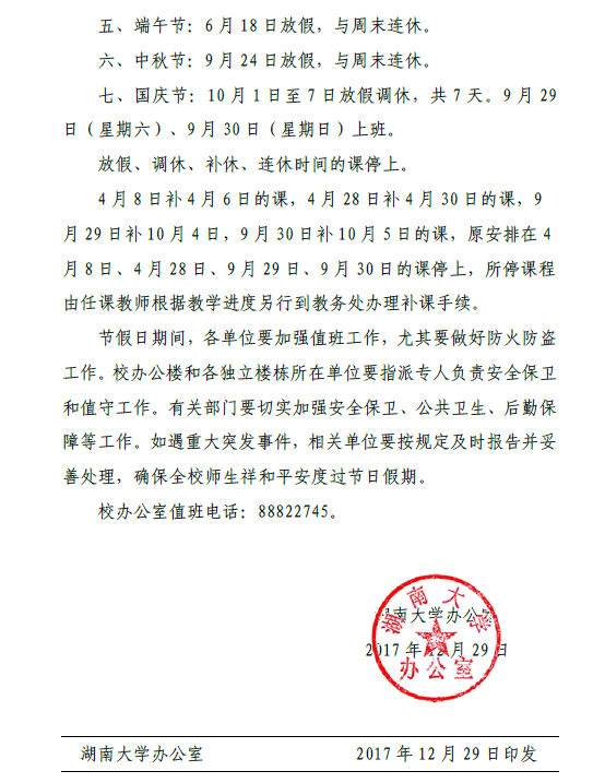 湖南大学关于2018年法定节假日放假安排的通知