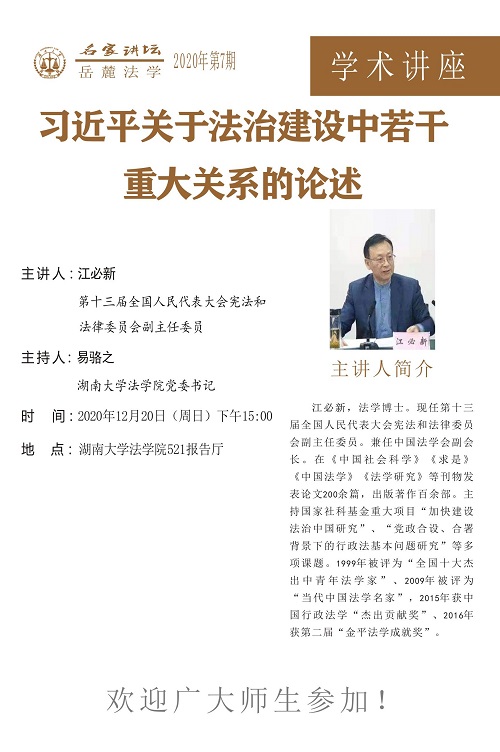 江必新,法学博士。现任第十三届全国人民代表大会宪法和法律委员会副主任委员。兼任中国法学会副会长。在《中国社会科学》《求是》《中国法学》《法学研究》等刊物发表论文200余篇,出版著作百余部。主持国家社科基金重大项目“加快建设法治中国研究”、“党政合设、合署背景下的行政法基本问题研究”等多项课题。1999年被评为“全国十大杰出中青年法学家”、2009年被评为“当代中国法学名家”,2015年获中国行政法学“杰出贡献奖”、2016年获第二届“金平法学成就奖”。