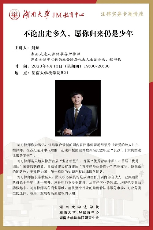 将与各实践单位开展系列法律实务讲座,本次讲座邀请到湖南天地人律所的刘舟律师为大家讲授。对想了解律师职业的同学来说,这将是一堂打开视野、打开认知格局的实务课,快来积极参与吧!