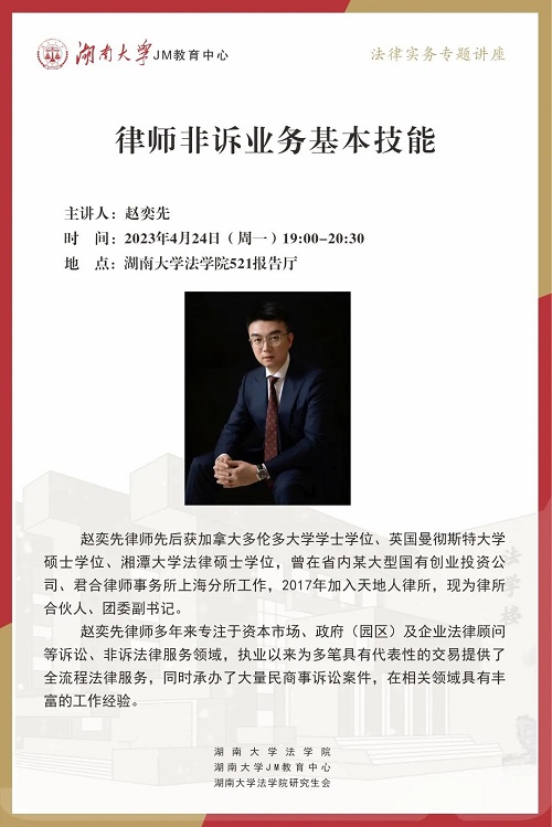 将与各实践单位合作开展法律实务系列讲座。本次JM实务讲座将由湖南天地人律所的赵奕先律师为大家分享律师非诉业务的基本技能。对想了解律师职业的同学来说,这将是一堂打开视野、打开认知格局的实务课,快来积极参与吧!
