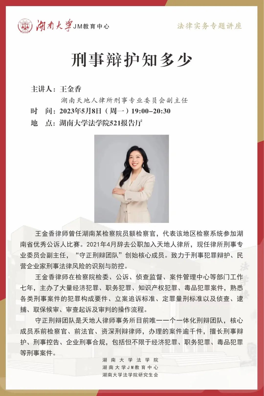 将与各实践单位合作开展法律实务系列讲座。本次JM实务讲座将由湖南天地人律所的王金香律师为大家分享刑辩律师的实务经验。对想了解刑事辩护执业经验的同学来说,这将是一堂极具干货的实务课,快来积极参与吧!