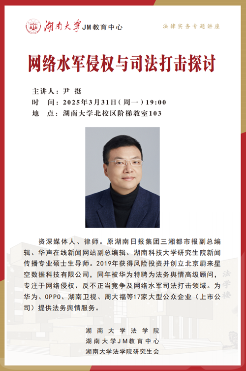 本次JM实务讲座邀请到资深媒体人、律师尹挺律师为大家讲述网络水军侵权与司法打击探讨,帮助大家了解相关实务问题,欢迎同学们积极参与!