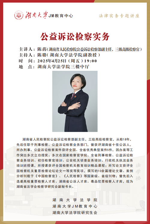 作为“检察实务专家进校园”系列专场,本次JM实务讲座特邀请到湖南省人民检察院检务督察部副主任,三级高级检察官——陈菂为大家讲述公益诉讼检察实务,帮助大家了解相关实务问题,棋牌游戏官网