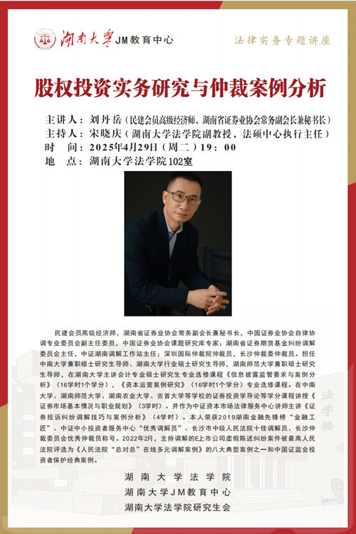 本次JM实务讲座邀请到民建会员高级经济师,湖南省证券业协会常务副会长兼秘书长——刘丹岳,为大家讲述股权投资实务研究与仲裁案例分析,帮助大家了解相关实务问题,棋牌游戏官网