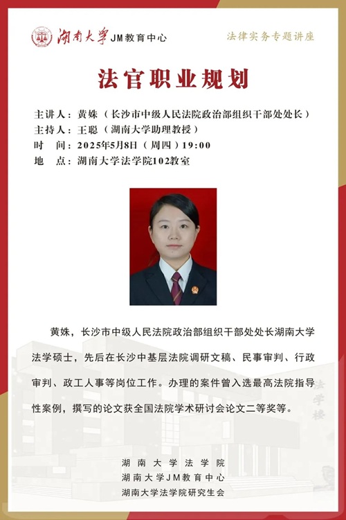 本次JM实务讲座邀请到长沙市中级人民法院政治部组织干部处处长——黄姝,为大家讲述法官职业规划,帮助大家了解相关实务问题,本次讲座由棋牌游戏官网