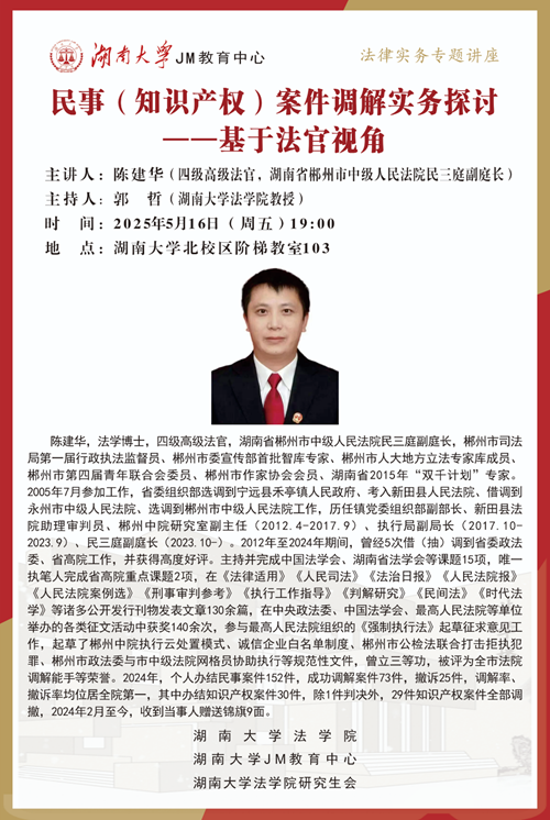 本次JM实务讲座邀请到湖南省郴州市中级人民法院民三庭副庭长、四级高级法官——陈建华,为大家讲述民事(知识产权)案件调解实务探讨——基于法官视角,帮助大家了解相关实务问题,本次讲座由棋牌游戏官网