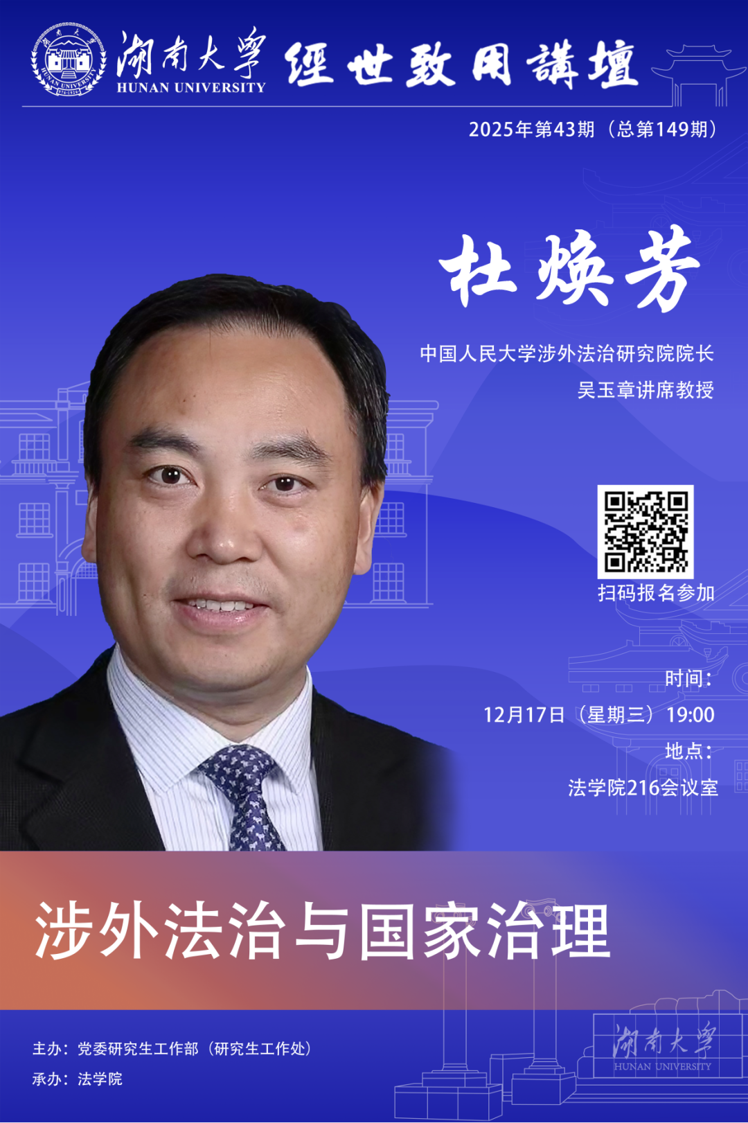 12月17日19:00邀请中国人民大学涉外法治研究院院长、吴玉章讲席教授杜焕芳于棋牌游戏官网