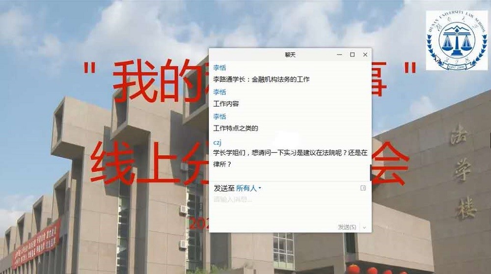 第二届优秀学生“赴港交流营”等;在实习方面,她从衣、食、住、行四个方面为我们一一介绍。就专业实践而言,她被分配至国家赔偿委员会办公室工作。在实习期间,实行实习导师制,由经验丰富的资深法官担任指导老师。法律实习生在实习期间担任实习法官助理、书记员或综合工作人员,在指导老师的帮助下,辅助参与案件审理、案件记录、文书起草、司法调研及司法行政等工作。最后,杨凌燕谈到,希望大家“常怀爱岗敬业责任心,永葆司法为民之情怀。追求卓越办案业务能力,熟稔现实方案理想之所在”!