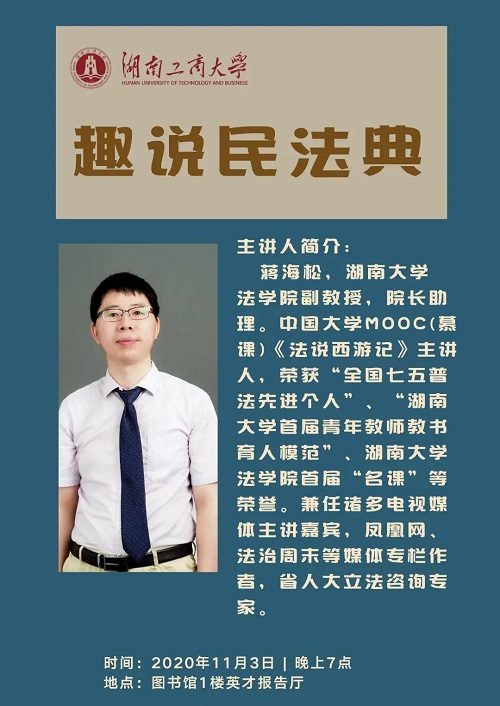 邀请于该校南校区图书馆1楼英才报告厅作“趣说民法典”主题讲座。讲座由该院蒋科老师主持,法管院长刘期湘、党委书记胡艳香、党委副书记袁露等老师出席,棋牌游戏官网