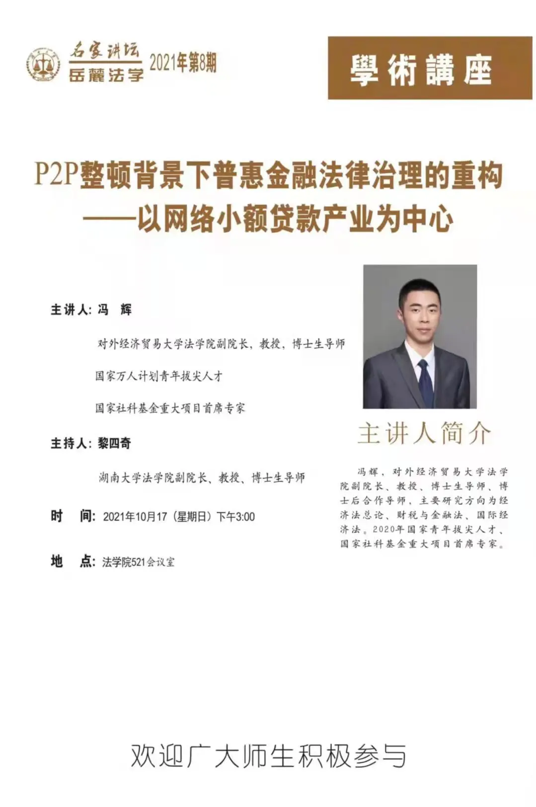 521会议室带来以“P2P整顿背景下普惠金融法律治理的重构——以网络小额贷款产业为中心”为主题的精彩的学术讲座。此次讲座由棋牌游戏官网