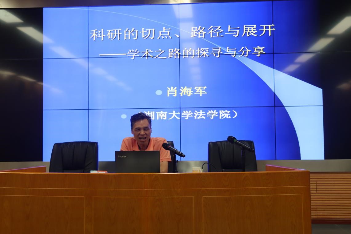 肖海军教授从自己的科研经历出发,讲述了由浮躁与迷茫到如今学术成果的系统化、体系化的过程,分享了自己“点—线—域—科”的科研路径;重点强调了研究的问题意识,对论文选题的现实依据与切入要点分别从“需求切入”“案例引入”“争点导入”“现象证入”“法条扣入”“创新介入”六个方面,结合自己的写作经验开展生动分享。最后提出做好科研需要热爱学术、静心养性、适度规划、严谨细致、执着恒定。