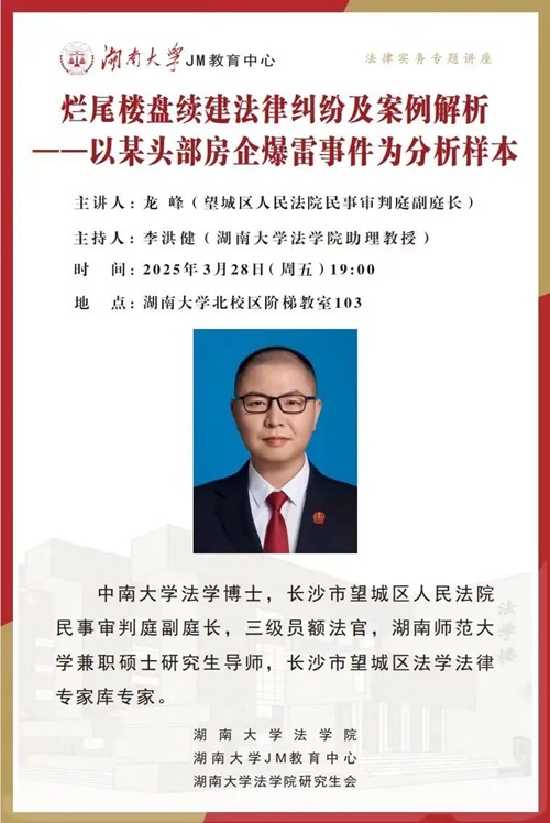 2025年3月28日晚19:00,龙峰法官在湖南大学北校区阶梯教室103以“烂尾楼盘续建法律纠纷及案例解析——以某头部房企爆雷事件为分析样本”为主题展开讲座,棋牌游戏官网
