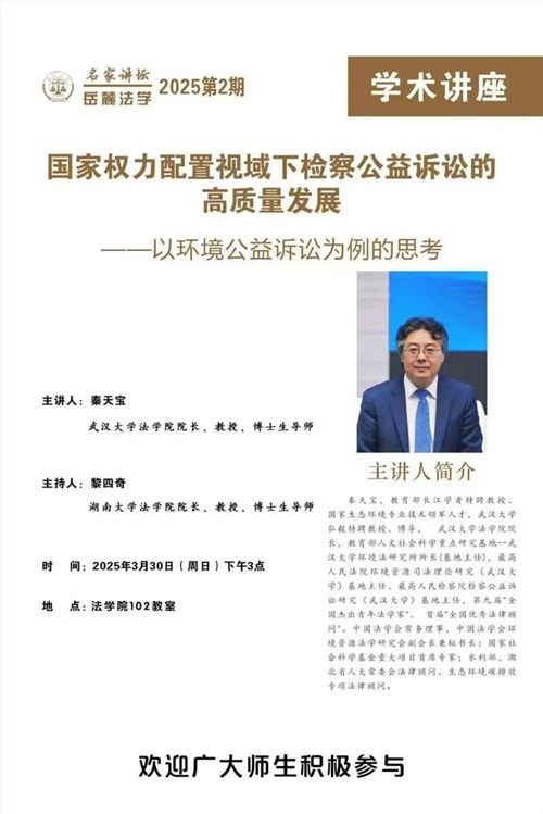 “岳麓法学名家讲坛”,主讲“国家权力配置视域下检察公益诉讼的高质量发展——以环境公益诉讼为例的思考”。讲座由棋牌游戏官网