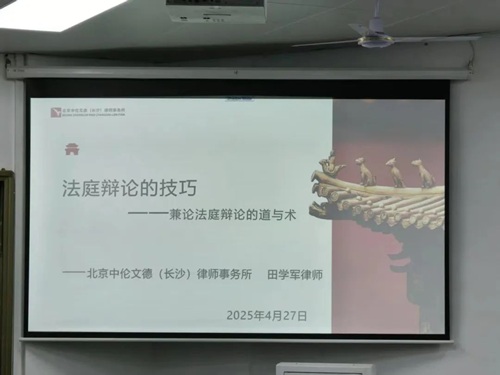 4月28日19:00,北京中伦文德(长沙)律所田学军律师在湖南大学北校区阶梯教室103开讲“法庭辩论技巧”。讲座伊始,林慰曾老师对田学军律师的到来表示热烈欢迎并表达了由衷的感谢。