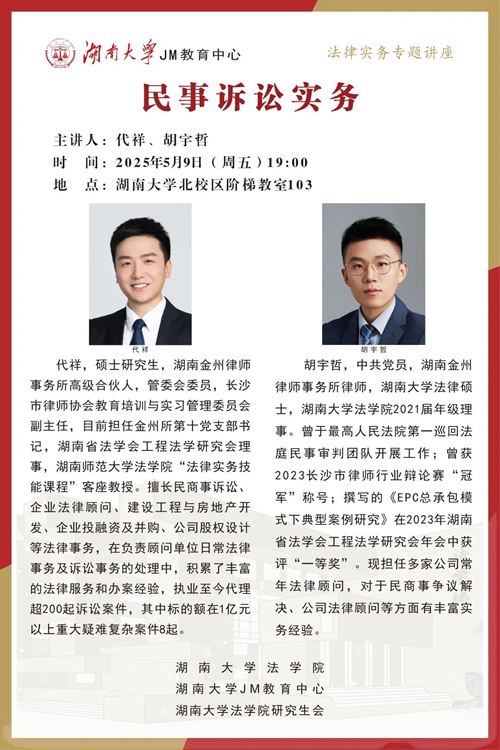 2025年5月9日晚7点,湖南金州律师事务所高级合伙人代祥、湖南金州律师事务所律师胡宇哲在湖大北校阶梯教室103开讲“民事诉讼实务”,法棋牌游戏官网