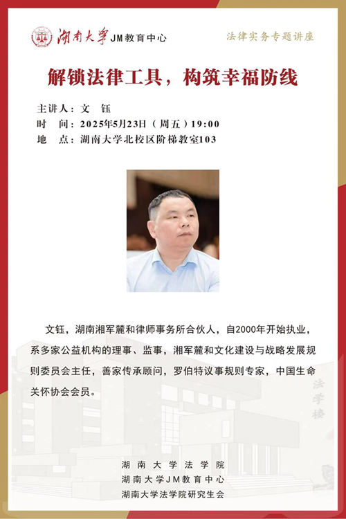 2025年5月23日晚19:00,湘军麓和律师事务所文钰律师在湖南大学北校区阶梯教室103展开讲座。文钰律师现任湖南湘军麓和律师事务所合伙人,自2000年开始执业,系多家公益机构的理事、监事,湘军麓和文化建设与战略发展规则委员会主任,善家传承顾问,罗伯特议事规则专家,中国生命关怀协会会员。法棋牌游戏官网