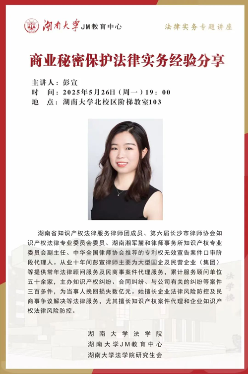 2025年5月26日晚七点,JM实务讲座邀请到湖南湘军麓和律师事务所二级合伙人、知识产权专业委员会副主任彭宣律师,为大家做了商业秘密保护法律实务经验分享,帮助大家了解相关实务问题。棋牌游戏官网