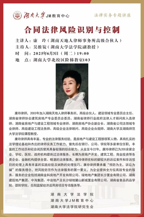 2025年5月15日星期四晚19点,湖南天地人律师事务所高级合伙人康玲律师在湖南大学北校区阶梯教室103教室展开讲座。讲座主题为《合同法律风险识别与控制》,棋牌游戏官网