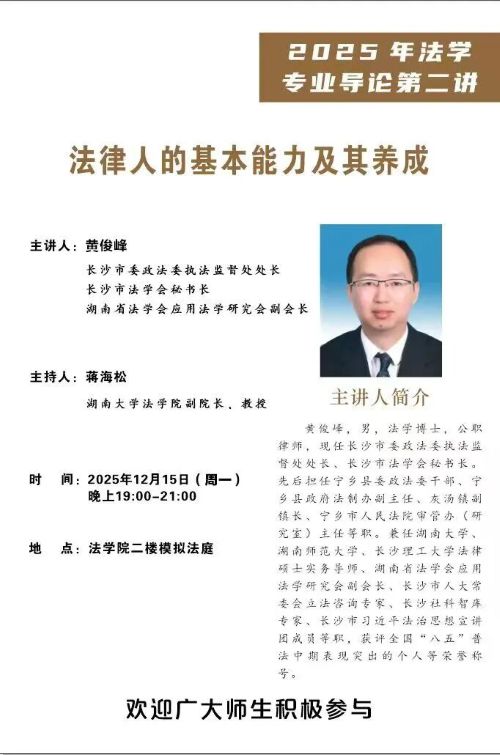 2025年法学专业导论第二讲于2025年12月15日于模拟法庭成功举办。长沙市委政法委执法监督处处长、长沙市法学会秘书长、棋牌游戏官网