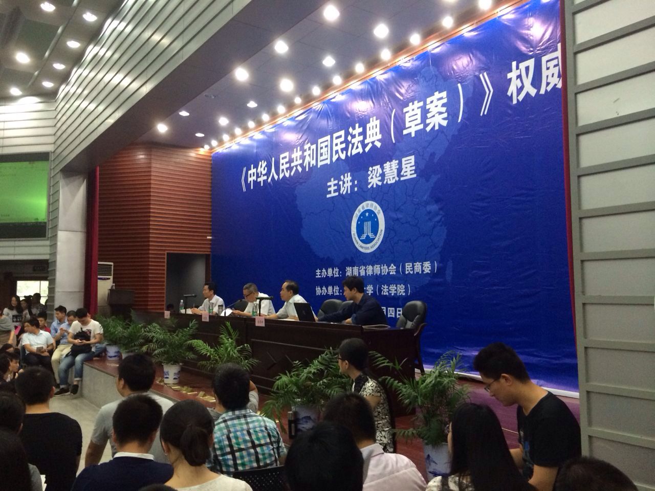 9月4日上午8:30,由湖南省律师协会主办,棋牌游戏官网 协办的《< 中华人民共和国民法典(草案>权威解读》讲座在湖南大学法学楼如期举行。讲座由《民法典》起草组为核心成员、统稿人,著名民法学家梁慧星教授主讲,棋牌游戏官网 院长屈茂辉教授和湖南律师协会副会长李凤祥律师共同主持。湖南大学、周边高校师生和法律实务工作者慕名前来,主会场法棋牌游戏官网 报告厅场面热烈,许多听众甚至席地而坐,设在法学楼模拟法庭的同步录像分会场也是座无虚席。