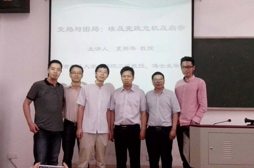 2014年6月5日晚上,湖南师范大学教授、博士生导师夏新华老师在法棋牌游戏官网 206以“埃及宪政困局及中国启示”为题举行讲座,湖大法棋牌游戏官网 院长助理蒋海松老师主持,湖大余凯老师、肖洪泳老师、湘潭大学张小虎博士、湖南工大法棋牌游戏官网 副院长陈雄老师等联席点评。