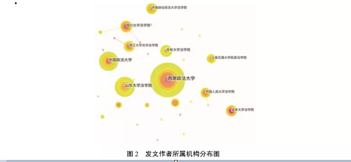 基于本文所选取的期刊文献样本,通过使用citespace软件对文献中所涉及研究机构进行分析, 首先得到研究机构的总体分析情况。如图2所示,西南政法大学、中国政法大学、山东大学法棋牌游戏官网